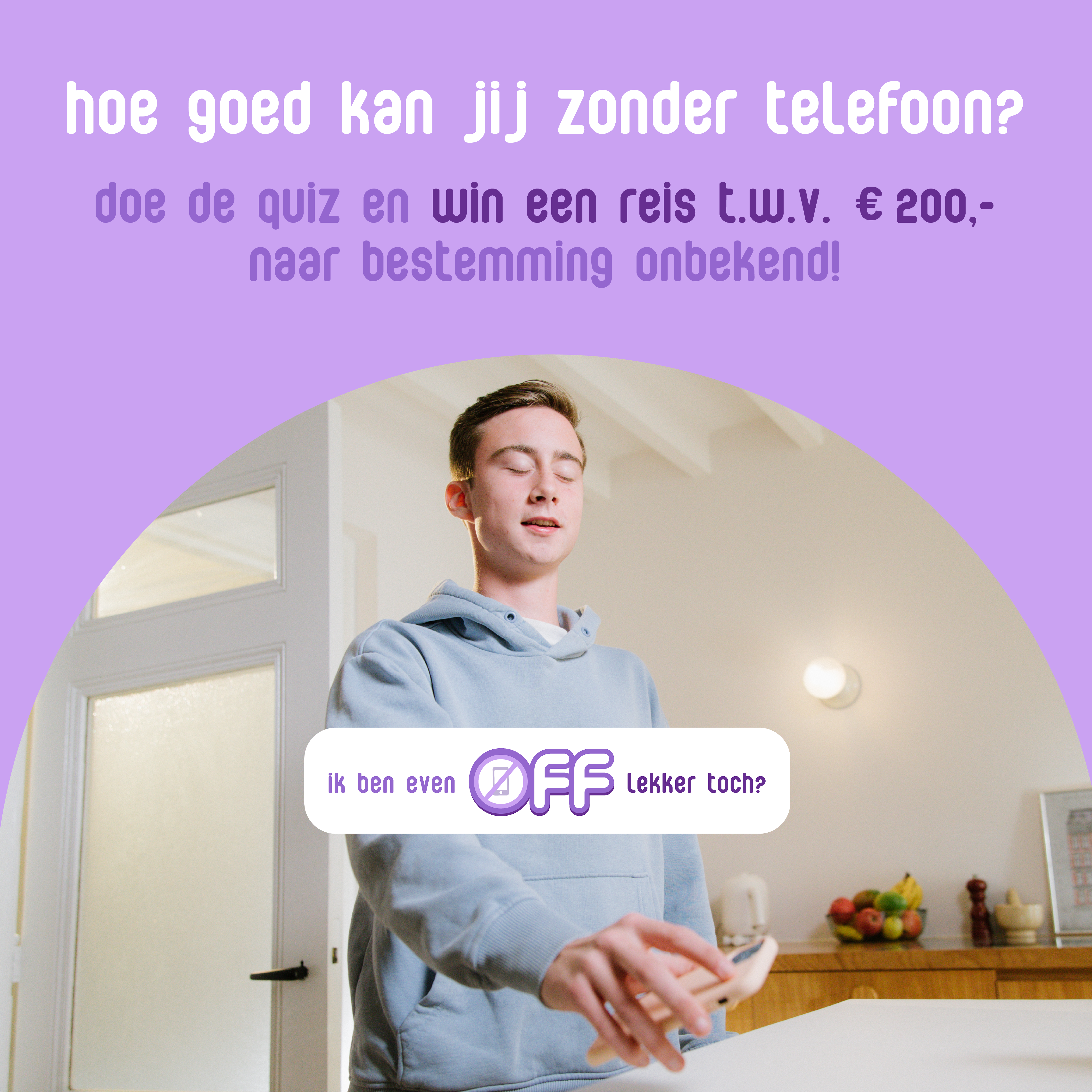 Laat ons weten hoe goed jij zonder je telefoon kunt en maak kans op een reis twv €200,-! Klik op de link hieronder en vul een korte vragenlijst in. Het kost slechts een minuutje van je tijd, succes!