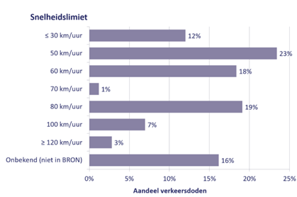 De overheid schat dat in circa 30% van de dodelijke verkeersongevallen een te hoge of niet-aangepaste snelheid een rol speelt[i]. Bovendien leidt een hogere snelheid vrijwel altijd tot een ernstigere afloop van het ongeval. Zo overleeft een voetganger een aanrijding bij 30 km/u in 95% van de gevallen, terwijl dat bij 50 km/u nog maar 60% is, en bij 80 km/u slechts 5%[ii]. Een voorrangsfout bij 30 km/u leidt dus waarschijnlijk tot wat blikschade, maar bij 80 km/u is de kans op (ernstige) gewonden of dodelijke afloop al zeer groot. In 2024 vonden bovendien 23% van de verkeersdoden plaats op wegen met een maximumsnelheid van 50 km/u en 19% bij 80 km/u [iii].