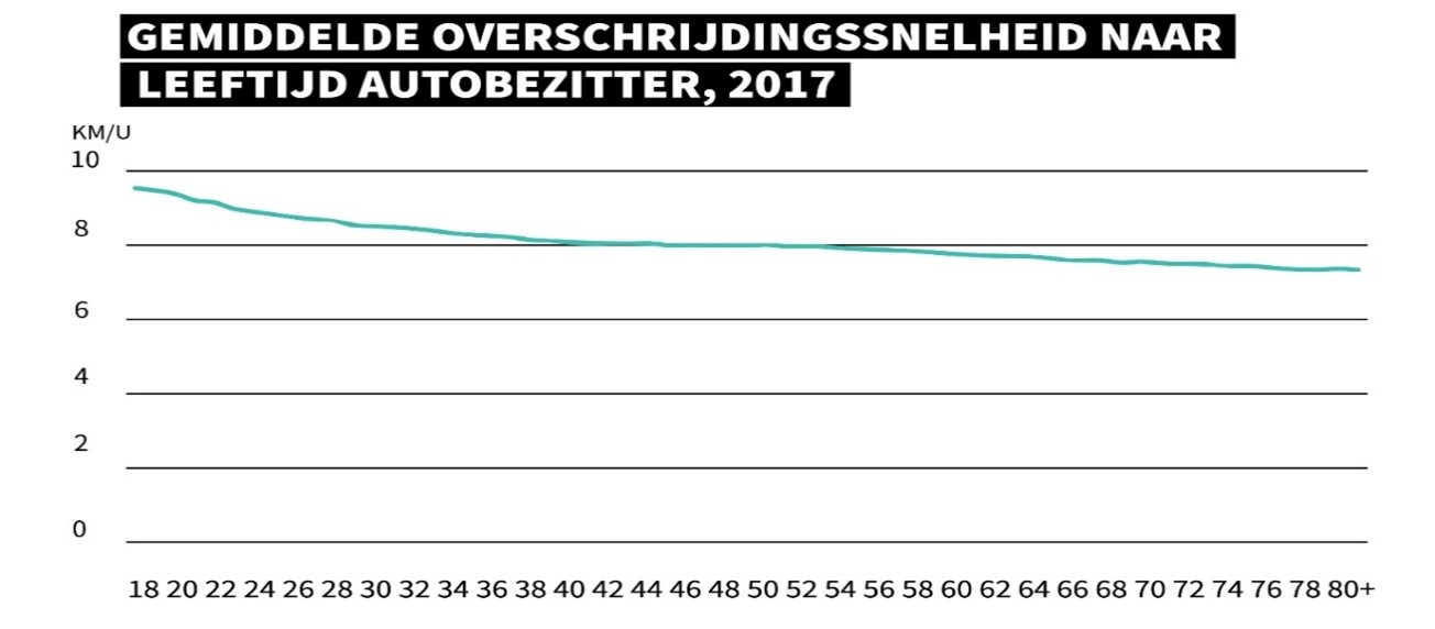 In Figuur 2 is te zien dat de gemiddelde overschrijdingssnelheid hoger ligt bij jongeren dan bij meer ervaren bestuurders. Hard rijden lijkt dus bij beginnende bestuurders een grotere rol te spelen dan bij ervaren automobilisten.